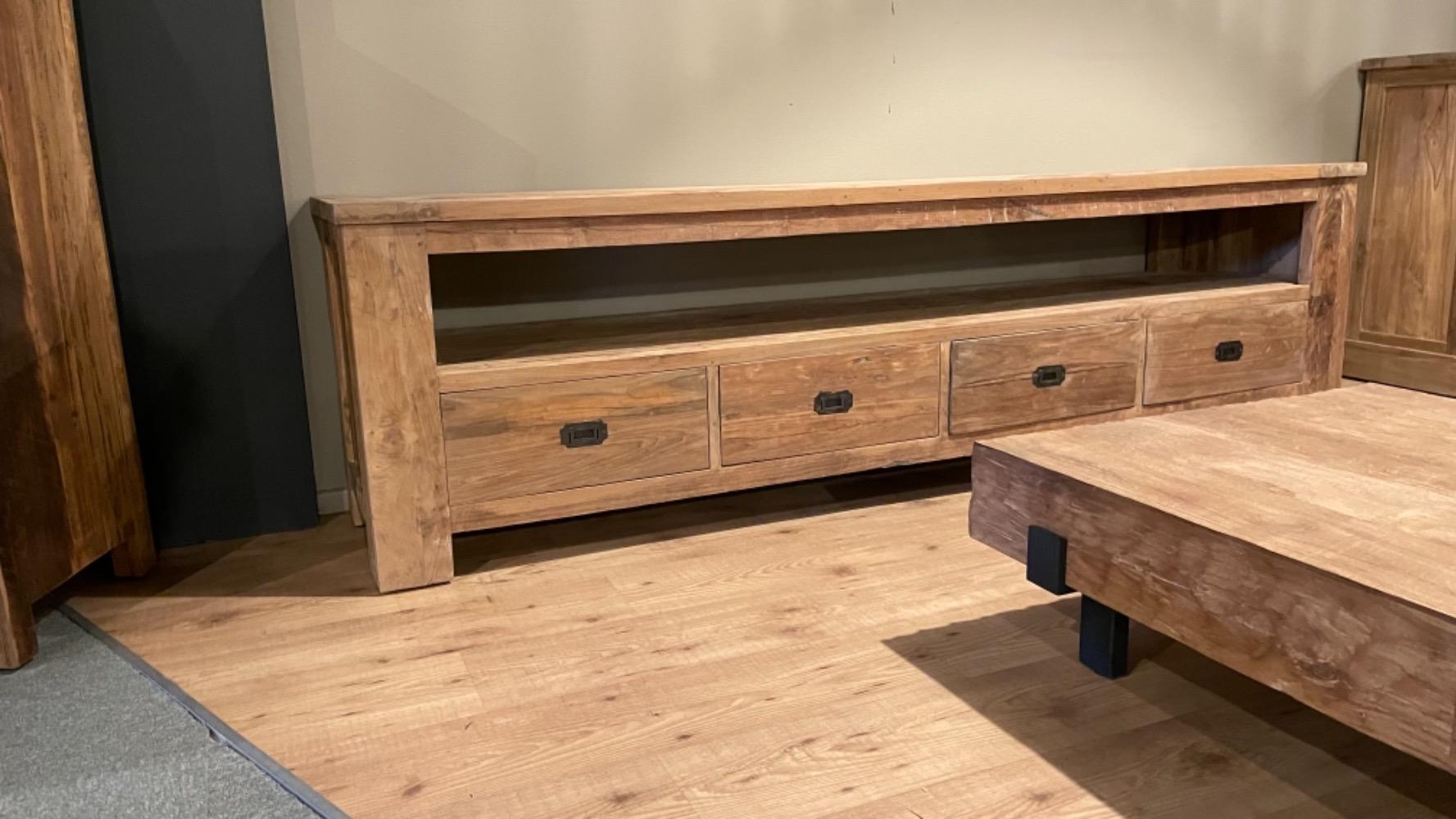 Uniek handgemaakt tv meubel van oud teakhout met 3 lades en open vak voor extra veel opbergruimte. Deze stoere tv meubelen produceren wij zelf van het mooiste hergebruikte teakhout met al zijn karakteristieke details. Daardoor is maatwerk met een beetje geduld geen enkel probleem.