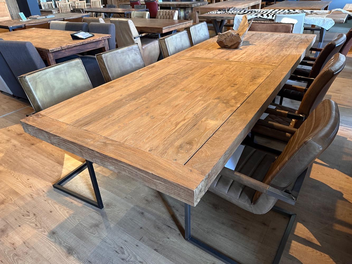 Een stoere eettafel gemaakt van hergebruikt teakhout. Deze tafel is direkt leverbaar in verschillende maten. Kom geWOON eens langs in Kessenich en kies je favoriete blad en onderstel zelf uit. Ontdek ook onze enorme collectie industriële eettafels op maat, oud eiken tafels uit eigen werkplaats en nog  veel meer voor een stoer landelijk, of industrieel interieur