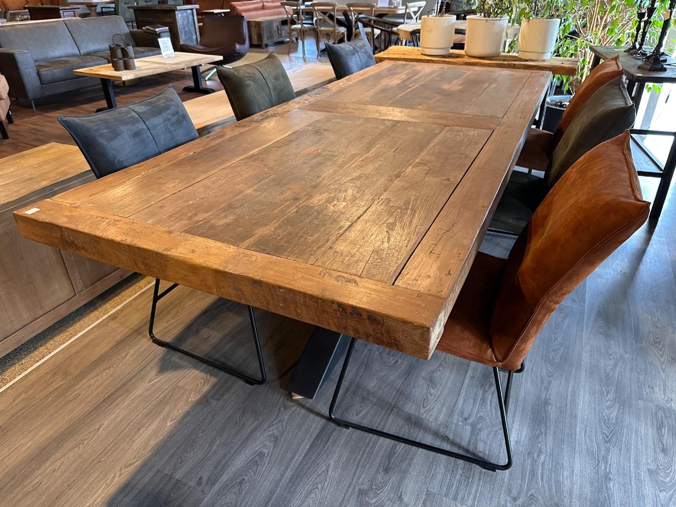 Een stoere eettafel gemaakt van hergebruikt teakhout. Deze tafel is direkt leverbaar in verschillende maten. Kom geWOON eens langs in Kessenich en kies je favoriete blad en onderstel zelf uit. Ontdek ook onze enorme collectie industriële eettafels op maat, oud eiken tafels uit eigen werkplaats en nog veel meer voor een stoer landelijk, of industrieel interieur