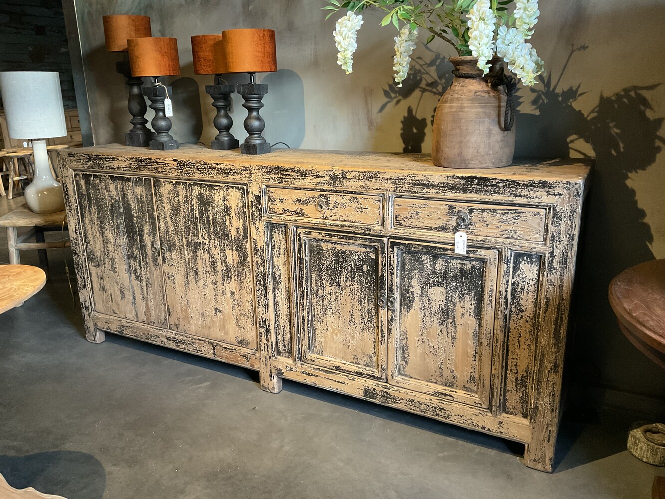 Uniek is deze dressoir in mat zwarte old finish. Gemaakt van stoer hergebruikt hout. One of a kind, dus weg=weg. We hebben momenteel een enorm assortiment unieke dressoirs in onze showrooms, Dressoirs, sidetables en kasten groot of klein met hun originele sobere eenvoud, of juist gerestyled tot een uniek exemplaar met een moderne finish.